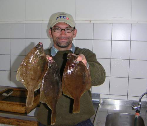 zu baden. Am ersten Tag versuchten wir es wie immer auf unsere Lieblingsfische, die Seelachse. Leider bissen sie nicht so gut, oder wir waren einfach am falschen Platz. So erwischten wir auch nur zwei. Trotz dem Wissen, dass die Grundfische am Laichen waren und verständlicherweise mit was Besserem beschäftigt waren, als unsere Fischfetzen zu fressen, versuchten wir unser Glück. Und siehe da, schon nach kurzer Zeit lagen ein Leng und ein Lumb von je knapp 90cm in unserer Kiste. Am zweiten Tag wechselten wir unseren Standort und fingen plötzlich einen Seelachs und Pollack nach dem anderen. Sie bissen so gut, dass es fast wieder langweilig wurde. Dies war dann auch am dritten und vierten Tag so. 3 bis 4 Stück gleichzeitig bis 80cm waren keine Seltenheit. Am fünften Tag versuchten wir es noch einmal auf Grund. Nachdem wir einen halben Tag zwischen 80 und 120m Tiefe keinen Biss spürten, beschlossen wir dann, trotz unseres Muskelkaters in den Armen, doch noch tiefer zu angeln. Als wir eine Stelle von 150m Tiefe fanden, liess ich runter und nach kurzer Zeit biss ein schöner Lumb. Ich liess also wieder meinen Köder an der gleichen Stelle zum Grund sinken und kaum unten angekommen, hing ein Leng von 95cm am Haken. Beim dritten Versuch dauerte es auch keine 5 Minuten, als ich einen heftigen Biss spürte und ein enormer Widerstand zu spüren war. Ich kurbelte im Eiltempo, obwohl meine Arme von den vielen Drills schon schmerzten. Nach einiger Zeit kamen ein Leng von 99cm und 101cm zusammen an die Oberfläche. Als ich das Michael erzählte, verriet mir sein schelmisches Lächeln schon, was er wohl dachte- „die dümmsten Bauern haben die grössten Kartoffeln“. Ich sage jedoch nur, das nichts über ein Höhentraining in den Schweizer Gebirgsbächen geht… J! Ich liess noch ein viertes Mal runter und wieder biss ein Fisch heftig, den ich aber nach ca. 50m verlor, weil er die Schnur durchbiss (0,90mm!). Da wir der Meinung waren, dass wir eine solche Beisswut nicht ausnutzen sollten und das Liebesleben der Fische nicht weiter stören wollten, entschieden wir uns zur Lodge zurückzufahren. Als ich dort Micha mein durchgebissenes Vorfach zeigte, meinte er, dass das nur ein Heilbutt gewesen sein konnte… Am letzten Tag entschieden wir uns für eine kleine Bucht in der Nähe der Anlage. Dort fingen wir einige schöne Plattfische und Knurrhähne. Wie
